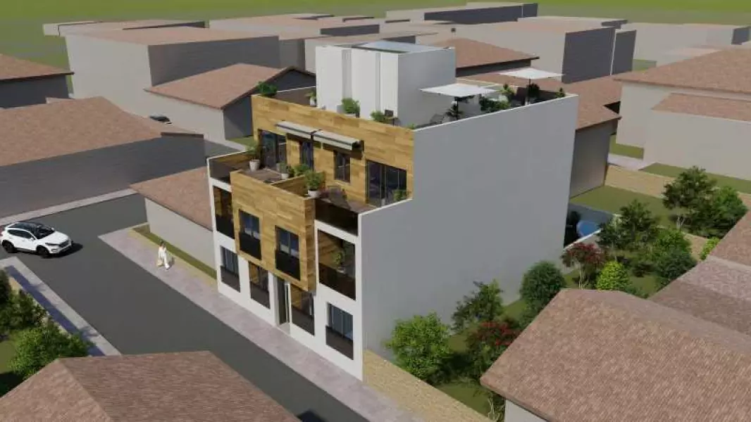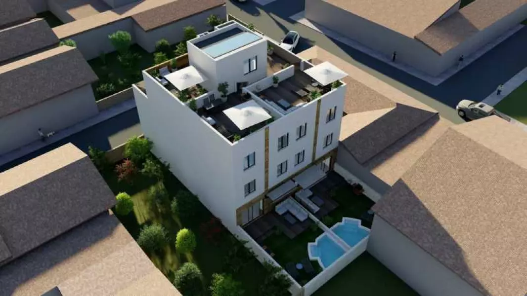Квартира на верхнем этаже площадью 83,4 кв.м. состоит из двух спален, двух ванных комнат, просторной гостиной с открытой кухней, просторной террасы и собственного солярия на крыше 46 кв.м., на которой можно любоваться шикарными видами, а также установить джакузи.