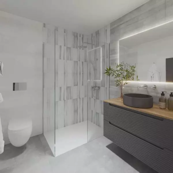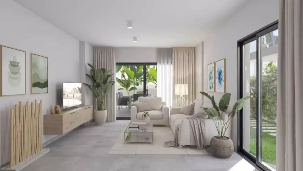 Бунгало на нижнем этаже площадью 95,75 кв.м. состоит из двух спален, двух ванных комнат, гостиной с меблированной открытой кухней, сада площадью 126,60 кв. м.