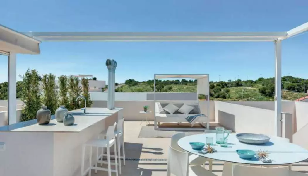 Бунгало в новом современном комплексе в городе Ориуэла Коста. Состоит из двух спален, двух ванных комнат, кухни с просторной гостиной, террасы и солярия (территория на крыше, где можно оборудовать зону отдыха, жарить барбекю, загорать).