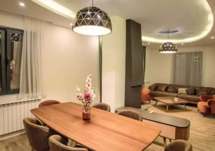 Удобство обеспечивают три ванные комнаты, три спальни и две гостиные. Бассейн 40 кубометров, с водопадом и гидромассажем.