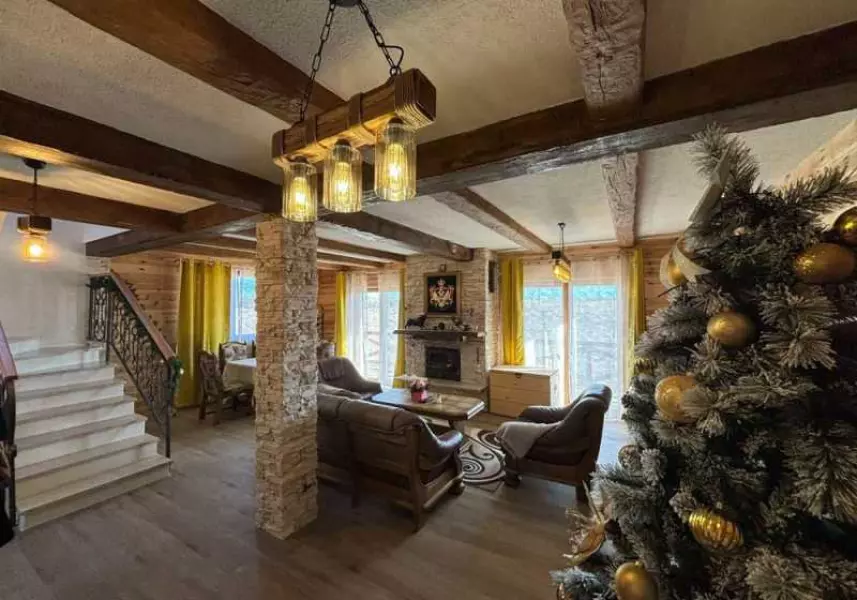 Второй этаж – большая гостиная с камином, кухней и столовой, санузел