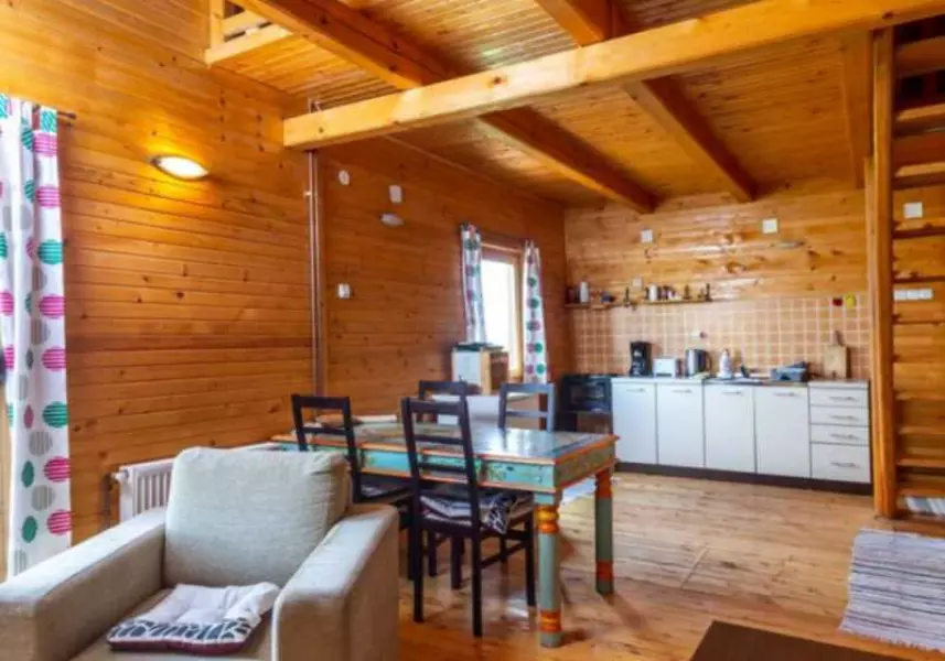 Бревенчатый домик состоит из: 3 спален, 2 ванных комнат с душем, кухни, гостиной, открытой галереи наверху, террасы, сауны и кладовой.