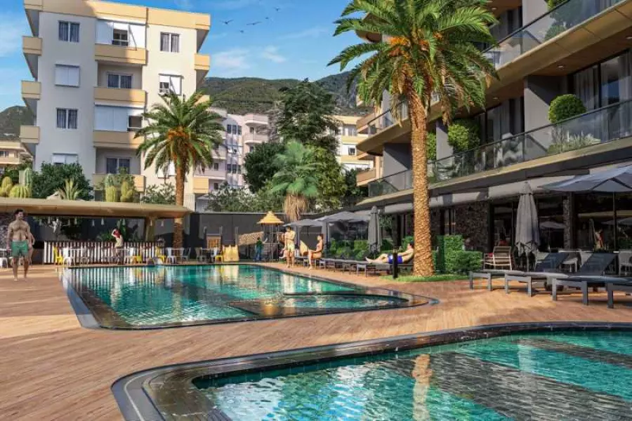 Эта 59.8 м2 квартира, расположенная на 6-м этаже (фактически 7-8 этаж) с северо-западной стороны, предлагает не только хорошую планировку, но и захватывающий вид на внутреннюю инфраструктуру комплекса и величественные горы в окружении.