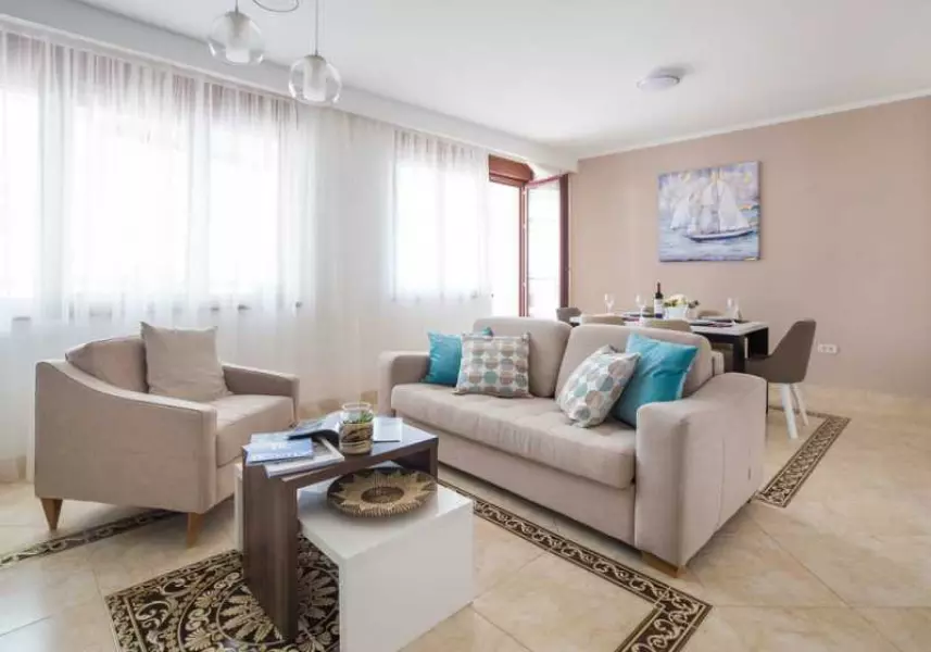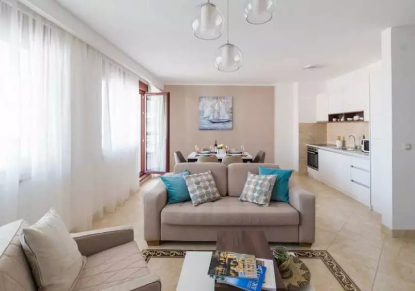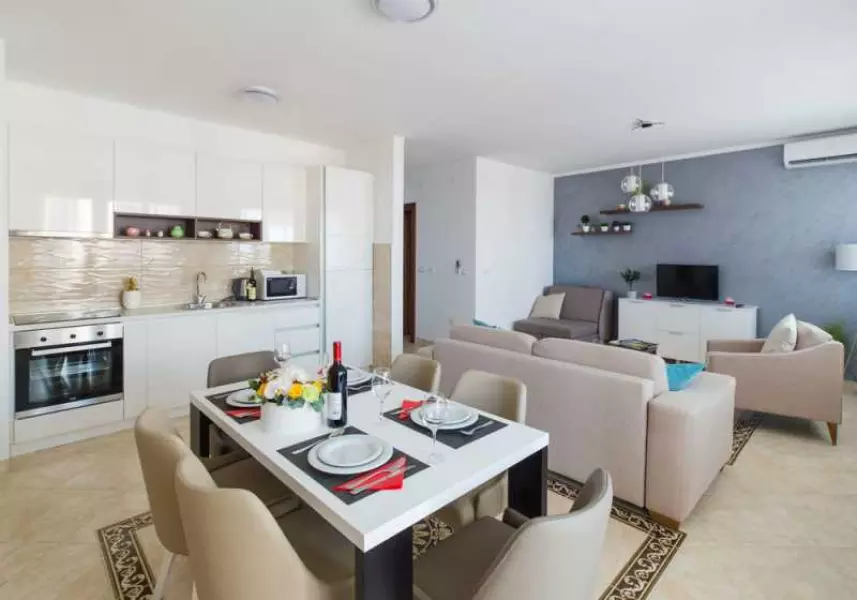 Очень выгодное положение комплекса – вблизи от замечательного пляжа, магазинов и ресторанов, и, в то же время, благодаря расположению на небольшой возвышенности, откуда открывается изумительный вид на Адриатику – придаёт ему функционал и приватность, где могут безопасно играть дети, и Вы можете наслаждаться тишиной, чистым воздухом, пением птиц и пейзажами.