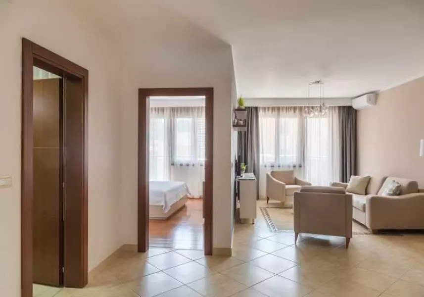 Очень выгодное положение комплекса – вблизи от замечательного пляжа, магазинов и ресторанов, и, в то же время, благодаря расположению на небольшой возвышенности, откуда открывается изумительный вид на Адриатику – придаёт ему функционал и приватность, где могут безопасно играть дети, и Вы можете наслаждаться тишиной, чистым воздухом, пением птиц и пейзажами.