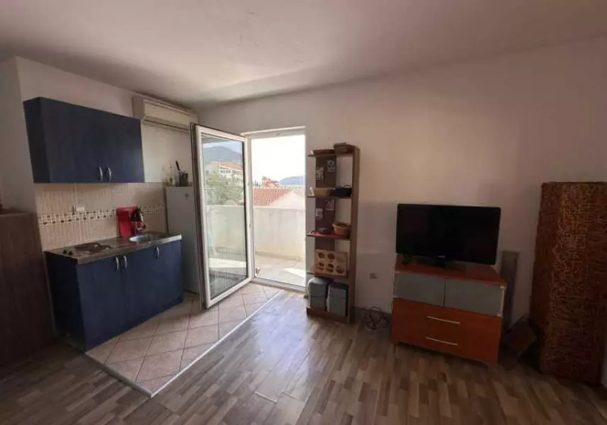 - гостиная с кухней и обеденной зоной, санузел с душевой кабиной и туалетом, терраса, одна спальня