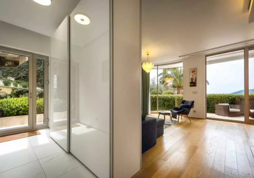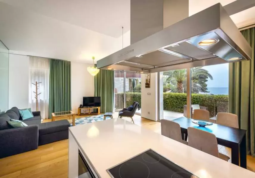 Панорамные окна гостиной открывают потрясающий вид на Будванскую ривьеру.