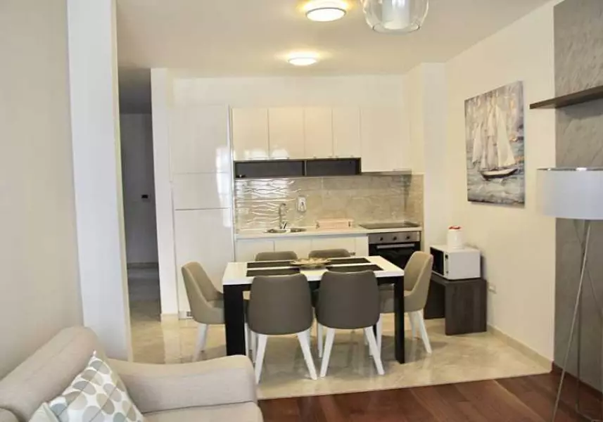 Очень выгодное положение комплекса – вблизи от замечательного пляжа, магазинов и ресторанов, и, в то же время, благодаря расположению на небольшой возвышенности, откуда открывается изумительный вид на Адриатику – придаёт ему функционал и приватность, где могут безопасно играть дети, и Вы можете наслаждаться тишиной, чистым воздухом, пением птиц и пейзажами.