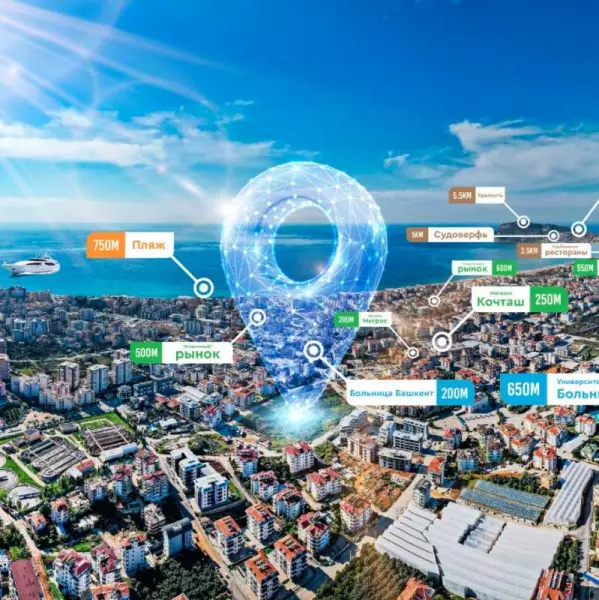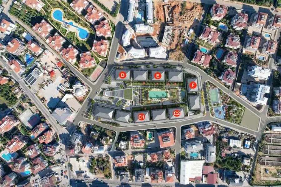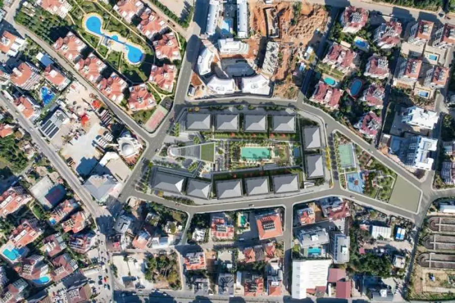 Комплекс-остров: с трех сторон окружен дорогой и с одной стороны главная улица в районе Оба. 95% квартир имеют открытый вид, расстояние до ближайшего противоположного блока составляет 55 метров.
