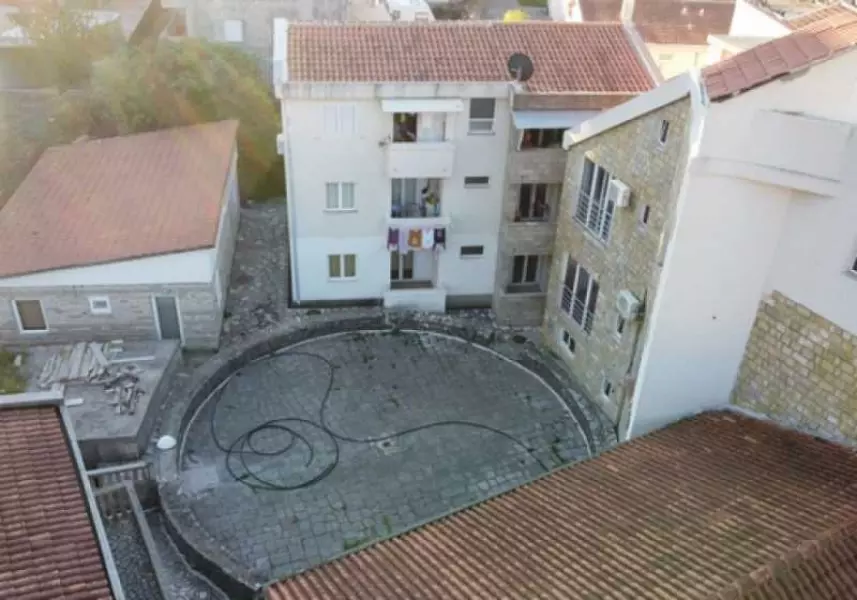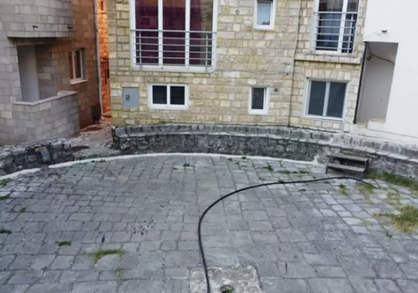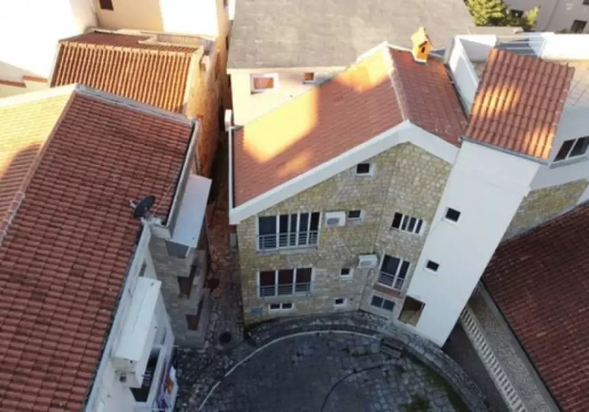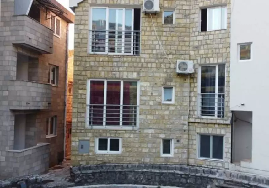 Здание облицовано натуральным камнем, имеет свой двор – исторический памятник. Двор – представляет собою древнее сооружение – место собрания старейшин всего побережья, где решались вопросы коллективного существования, противостояния врагам, способы взаимодействия в различных ситуациях, договаривались о женитьбе сыновей и выдаче замуж дочерей, об эквивалентных обменных ценах товаров, которые производили разные общины. Этот памятник старины, находящийся под охраной государства – украшает собою быт гостей отеля, от него веет древностью и историей. Здесь гости собираются по вечерам для непринуждённой беседы, за бокалом шикарного черногорского вина и нарезки из пршута и великолепных домашних сыров. Площадь этого сооружения около 70 кв.м., оно имеет форму круга, и выполнено из натуральных тёсаных каменных блоков.