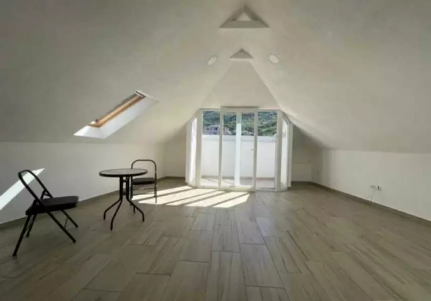 Прихожая, гостиная, зона кухни и столовой, терраса с видом на горы, одна спальня, санузел с душевой кабиной и туалетом.