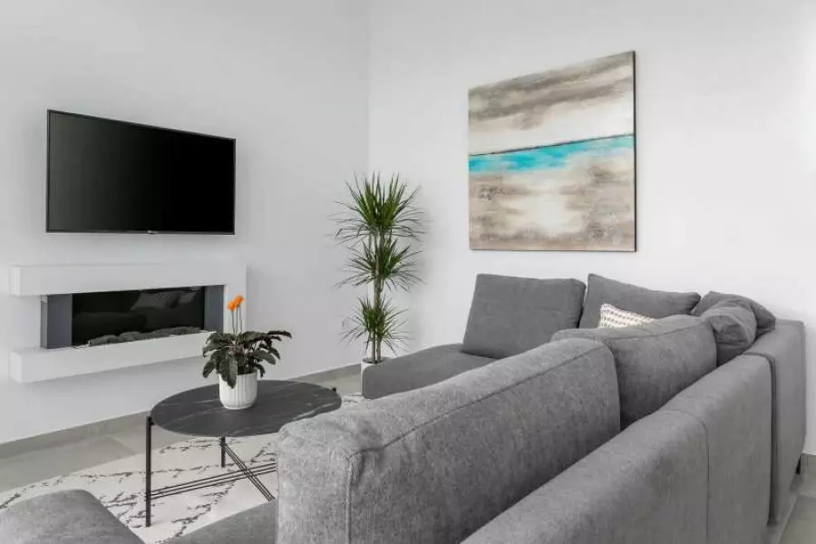 Современная вилла площадью 118 кв. м, состоит из гостиной, столовой, открытой кухни, трех спален, двух ванных комнат и террасы. На участке площадью 540 кв.м есть парковка на две машины, сад и бассейн.