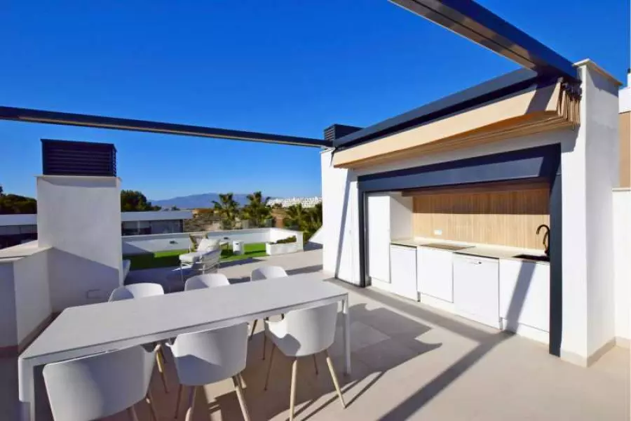 Просторная и современная вилла в один этаж площадью 117,10 кв. м. Состоит из трех спален, двух ванных комнат, кухни-гостиной и солярия 115,25 кв.м. (большая терраса на крыше, где можно оборудовать зону отдыха, установить джакузи, загорать, готовить барбекю). Дом расположен на участке 327,20 кв. м. с парковкой, зоной отдыха, а также есть возможность оборудовать бассейн.
