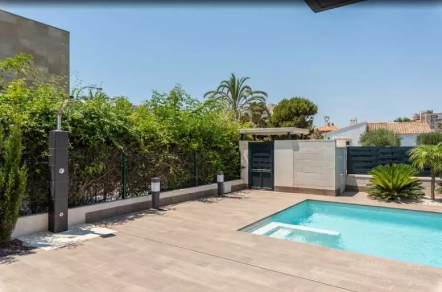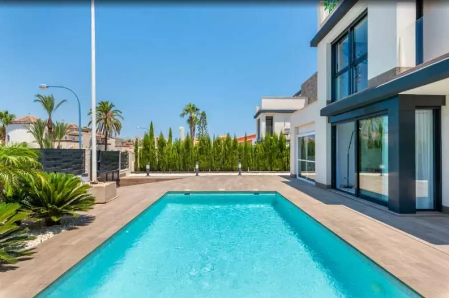 Новая готовая вилла от застройщика в три этажа, общей площадью 153 м2. В доме пять комнат на основных этажах: гостиная-столовая, кухня открытого типа, четыре спальни, три ванные комнаты и цокольный этаж (можно использовать как жилое помещение, кинотеатр, спорт зал и т.д. Кухня меблирована и оборудована бытовой техникой. В ванных комнатах дизайнерская мебель и теплые полы. Дом полностью меблирован, оборудован техникой. Система кондиционирования, система умный дом, вентиляция, видеонаблюдение, интернет, ТВ, автоматические жалюзи на окнах. Собственный земельный участок 430 м2, благоустроен зонами отдыха, бассейном, зеленым насаждением. По всему периметру двора установлено освещение, противоскользящие дорожки. На крыше оборудована зона для отдыха, на которой можно загорать, жарить барбекю, наслаждаться прекрасными видами на Мар Менор.