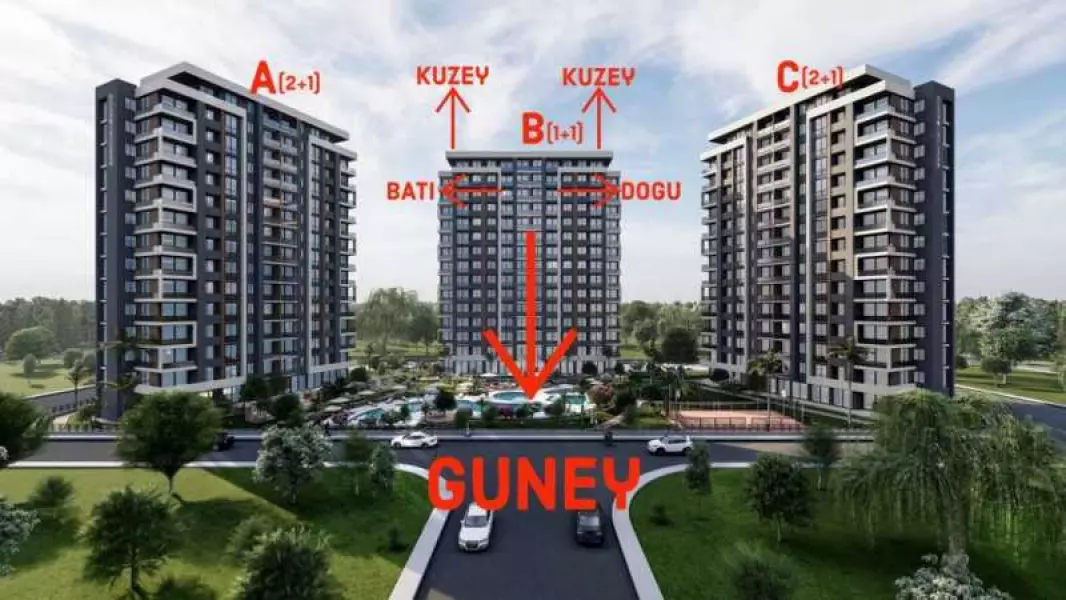 Блоки A и C состоят из квартир 2+1, блок B из квартир 1+1.