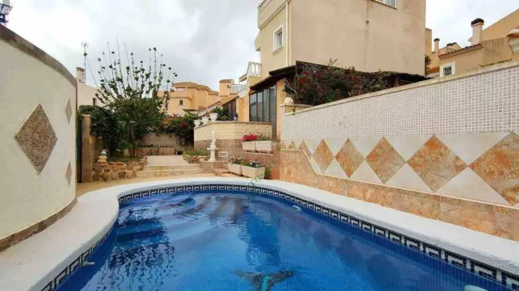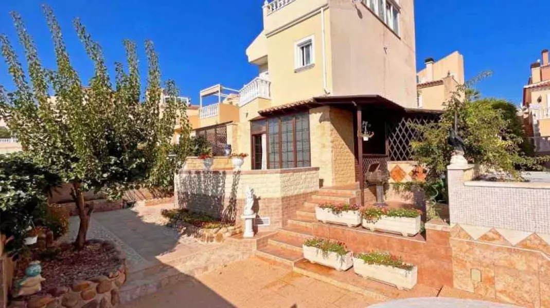Дом на участке 201 кв.м.находится в закрытой урбанизации с бассейном. В дом можно попасть через пешеходные ворота или ворота гаража. Перед домом выложенная плиткой терраса, красивые деревья и цветы. На участке находится бассейн с морской водой. С правой стороны дома расположена большая крытая терраса с летней кухней и обеденной зоной. Рядом с этим пространством находится полностью оборудованная ванная комната с душем и сауной, а также кладовая.