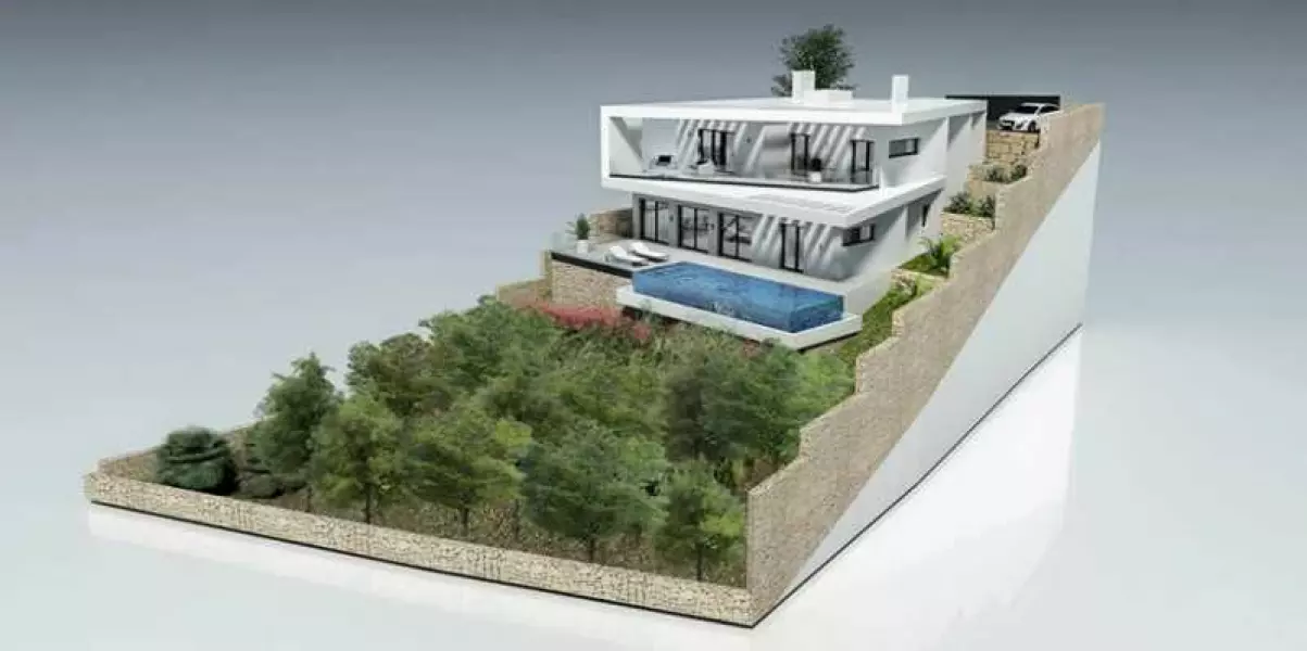 Вилла занимает площадь 560 кв. м, имеет три этажа, соединенных лифтом. В доме четыре спальни, каждая со своей ванной комнатой. Все комнаты, включая ванные комнаты, выходят на террасу и ориентированы окнами на море. Большая гостиная с открытой кухней с выходом на обширную террасу с бассейном 30 кв. м с переливом. На нижнем уровне находится большое помещение, которое по желанию может быть оборудовано под спортивный зал или под зону отдыха с бильярдом и сауной. Земельный участок, площадью 841 кв. м с красивым садом и парковкой. Во всем доме установлена система кондиционирования, охранная сигнализация, теплые полы.