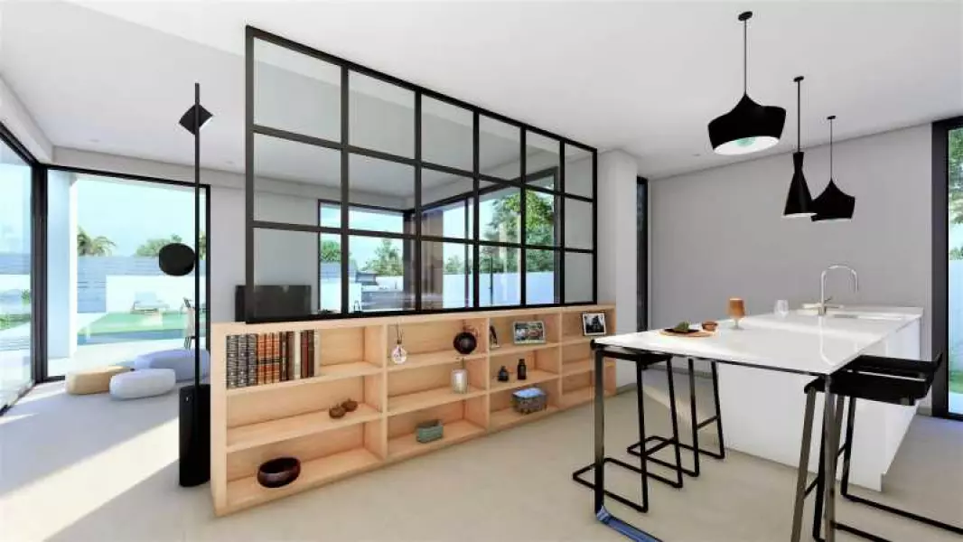 Просторная гостиная наполнена естественным светом благодаря большим окнам, визуально соединяющим её с садом. Кухня объединена с обеденной зоной, формирующей центр семейной жизни в дневное время. Пространство внутри и снаружи связывается через многочисленные стеклянные проемы, а мебель с четкими линиями добавляет общему интерьеру стиль и уют. Ванные комнаты, оформленные в теплых природных тонах, создают атмосферу уюта и расслабленности, обеспечивая связь с природой и даря минуты покоя. Главная спальня располагает собственным частным двориком, который привносит ощущение спокойствия и отдыха.