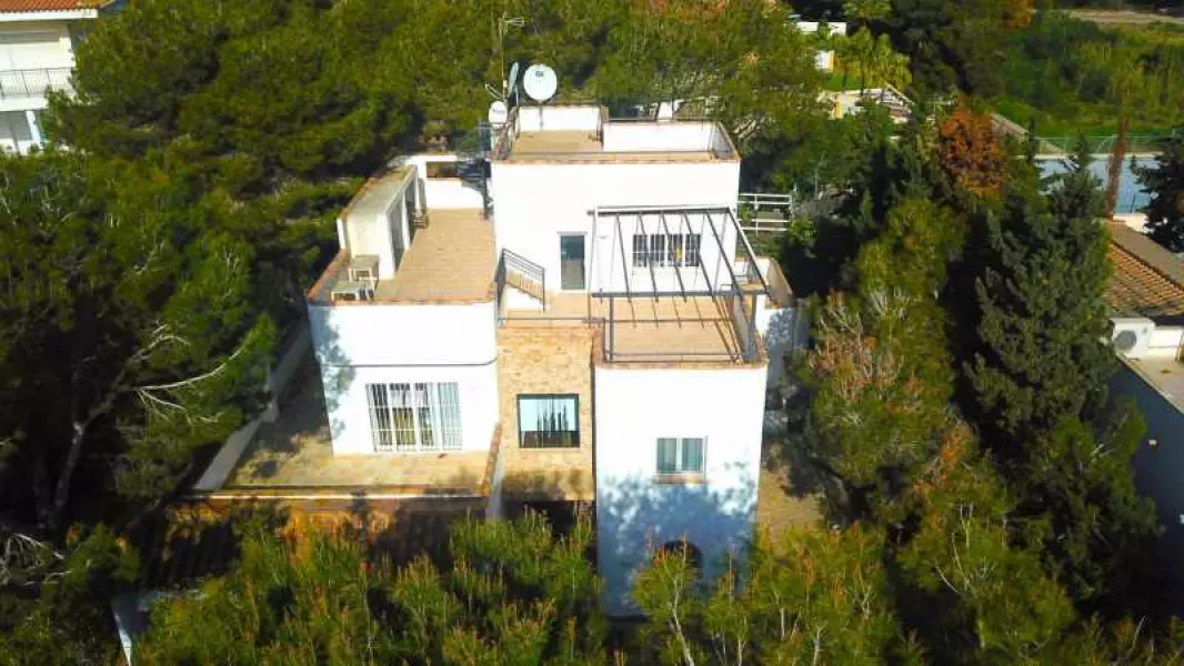 Дом в отличном состоянии общей площадью 270 кв. м. расположился на участке 800 кв.м. состоит из трех спален, двух ванных комнат, просторной гостиной с обеденной зоной, современной кухни. На цокольном этаже есть гараж, погреб и кладовая. На первом этаже расположены гостиная-столовая, спальни и ванные комнаты. Верхний этаж предназначен для солярия площадью 20 м2. В доме центральное кондиционирование, газовое отопление, камин в гостиной, мраморные полы, автоматические жалюзи, солнечные батареи на крыше. На территории есть частный сад с бассейном и закрытый гараж. С террас открывается великолепный вид на море и сосновый лес.