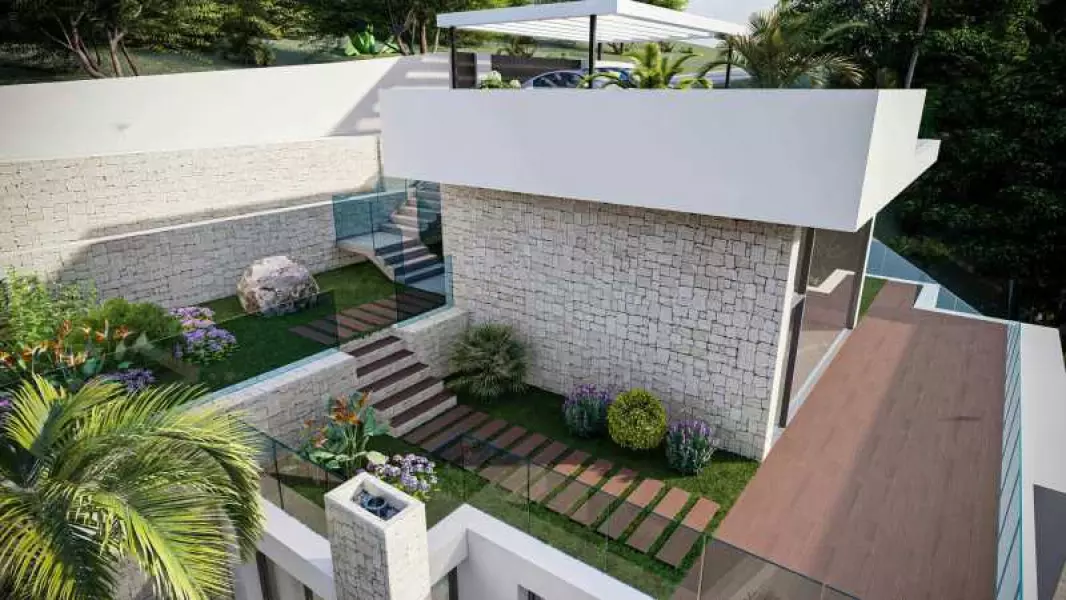 Вилла в три этажа, имеет пять спален, пять ванных комнат, террасу, бассейн 40 кв.м., парковку на два авто. На первом этаже расположены четыре спальни, каждая со своей ванной комнатой. Главная спальня оборудована просторной гардеробной комнатой, в остальных спальнях есть встроенные шкафы. На втором этаже расположена просторная гостевая-столовая, где также расположена кухня и гостевой туалет. Из гостиной есть выход на просторную террасу с видом на море, а также к бассейну и зоне барбекю. Дом оснащен системой кондиционирования, также имеет бронированную дверь, прачечную.