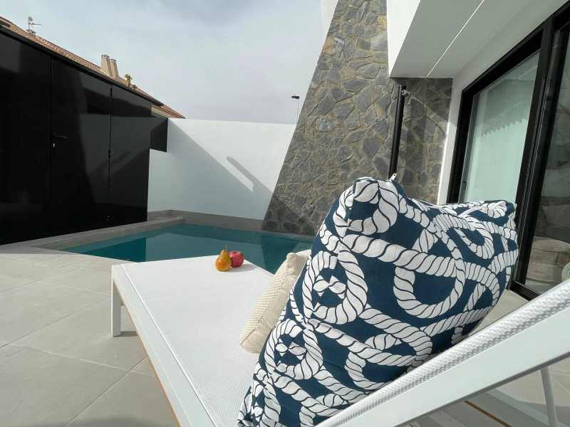 Вилла площадью 94 кв. м. имеет просторную гостиную и открытую кухню, три спальни, две ванные комнаты, террасу. Также есть просторный солярий, где можно оборудовать зону отдыха и барбекю. На участке площадью 120 кв. м расположен собственный бассейн, парковка для автомобиля, зоны отдыха.