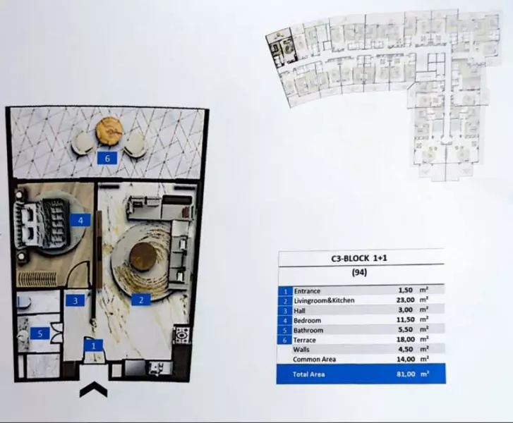 Квартира 1+1 площадью 81 м2 находится на пятом этаже нового комплекса.