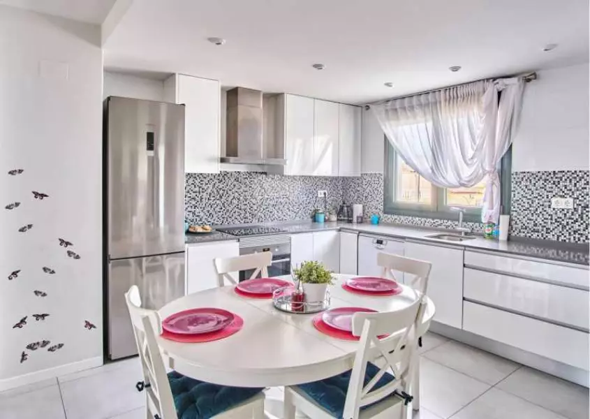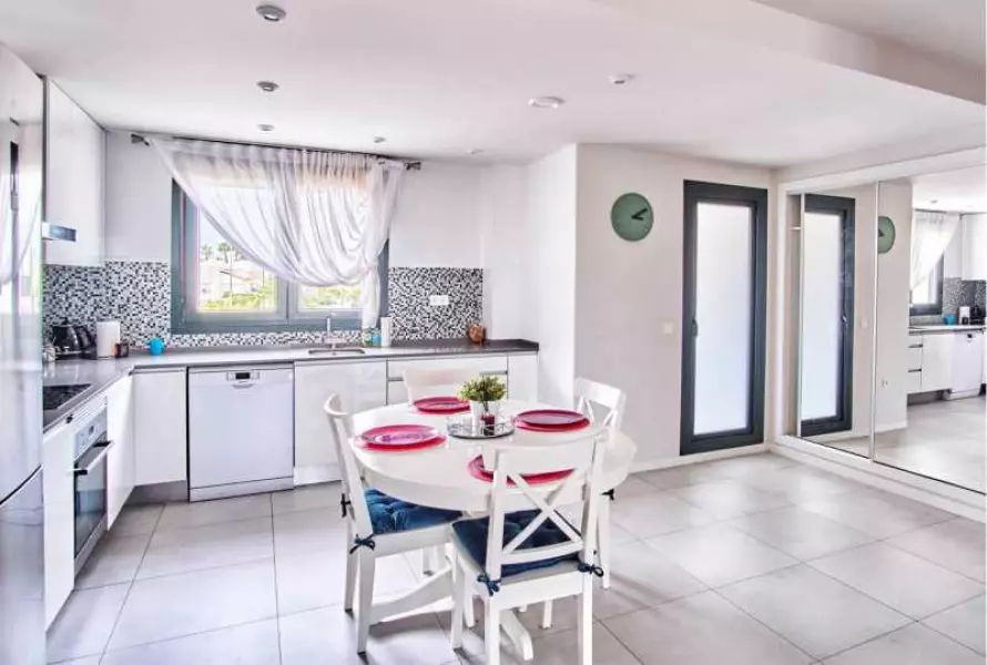 Квартира состоит из двух спален, одной ванной комнаты, просторной кухни открытого типа со столовой зоной, гостиной с выходном на большую террасу, откуда открываются виды на окрестности. Общая площадь квартиры 85 кв.м.