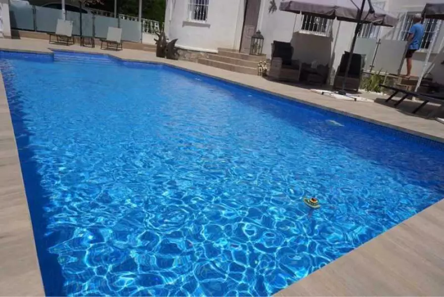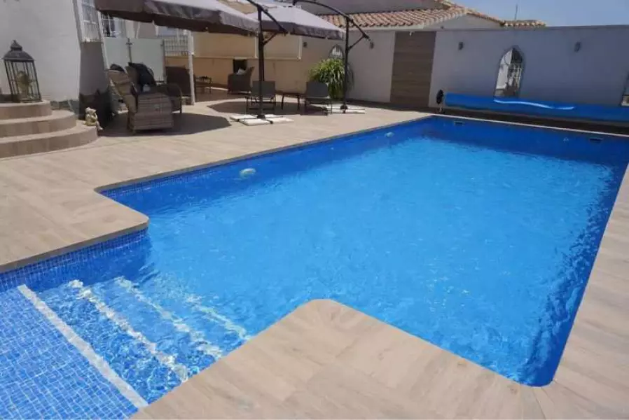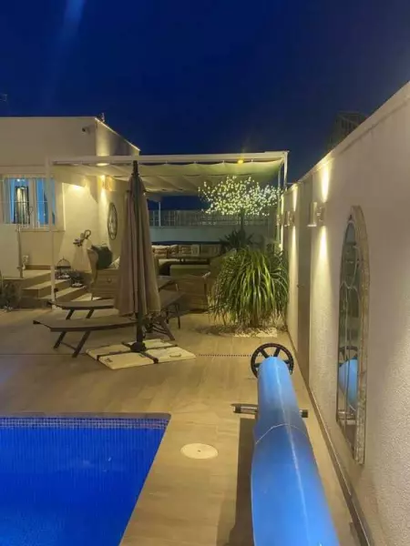 Дом площадью 110 кв. м. имеет три большие спальни (одна из них с ванной), две ванные комнаты с душем, кухня с барной стойкой с кладовой и новой бытовой техникой, светлая гостиная с двумя выходами в сад. Продается полностью меблированным. В саду есть несколько зон для отдыха и релаксации. Имеется закрытая веранда с навесами, садовой мебелью и успокаивающим декоративным фонтаном. На участке зоны для загара рядом с бассейном, несколько складских помещений, бильярдный стол и алюминиевый навес для машины.