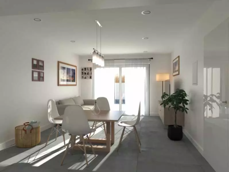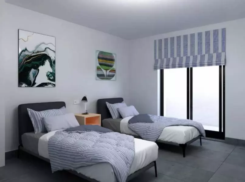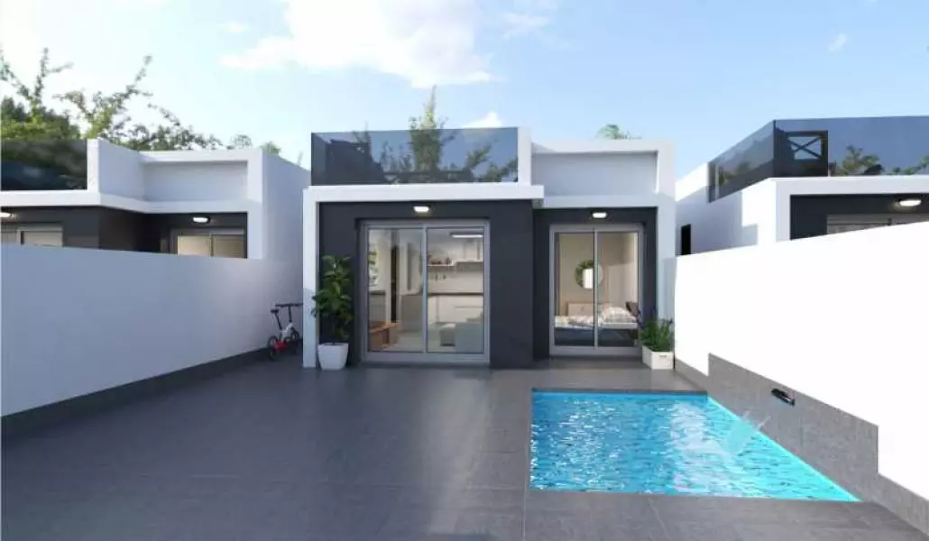 Дом в два этажа, жилой площадью 88 м2 и собственным участком земли 175 м2 с бассейном, где можно оборудовать зону отдыха и барбекю. Состоит из гостиной, открытой кухни, трех спальных и двух ванных комнат, террасы на втором этаже 77 м2. В стоимость включено: мебель на кухне, автоматические жалюзи на окнах, оборудованные ванные комнаты, бронированная дверь, видеофон, предустановка кондиционера, ТВ, телефона, система вентиляции, нескользящее покрытие во дворе, бассейн.