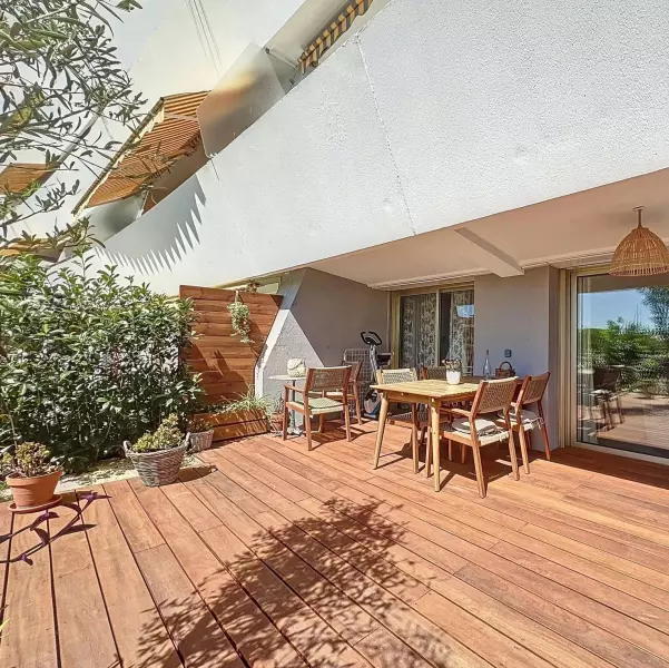 Эти апартаменты, полностью отремонтированные со вкусом и с использованием высококачественных материалов, располагают деревянной террасой (деревянные рейки кумару) и садом площадью 40 м2, выходящим на южную сторону.