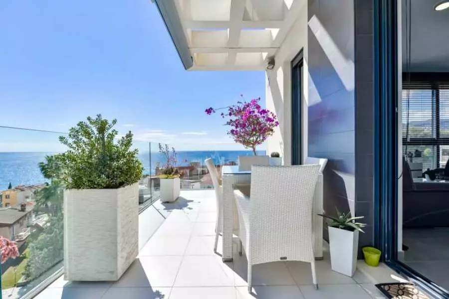 Внутри вас ждет просторная и светлая гостиная с открытой кухней, идеальная для общения. Большие окна обеспечивают обилие естественного света в течение всего дня. Вы также сможете насладиться прекрасной террасой с захватывающим видом на море — настоящий оазис спокойствия.
