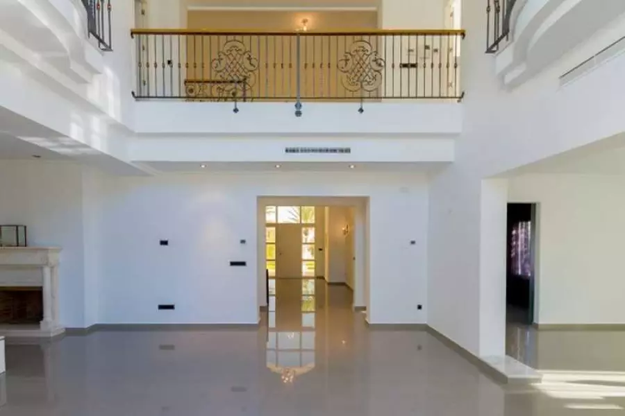На первом этаже находится большая и светлая прихожая и мраморная лестница. Из гостиной есть выход на одну из открытых террас и в столовую, которая имеет выход на большую кухню. Также есть две спальни с гардеробными и ванными комнатами в каждой из них. В коридоре есть еще одна ванная комната.