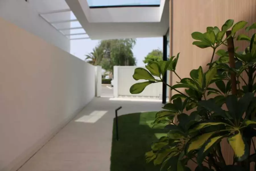 Вилла имеет три уровня и состоит из гостиной с открытой кухней, трех спален, двух ванных комнат, двух террас и солярия (это территория на крыше, где можно оборудовать зону отдыха, барбекю). На участке площадью 207 кв. м находится большой бассейн, зона отдыха и сад.
