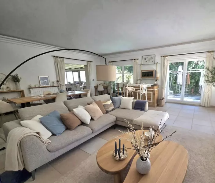В нескольких минутах от деревни и магазинов находится очень красивая отдельно стоящая вилла, оформленная в сдержанном и изысканном современном стиле. В целом, на первом этаже вы найдете прекрасную гостиную с видом на холмы, отдельную и оборудованную кухню, три красивые спальни, приятную библиотеку, две ванные комнаты и три туалета.