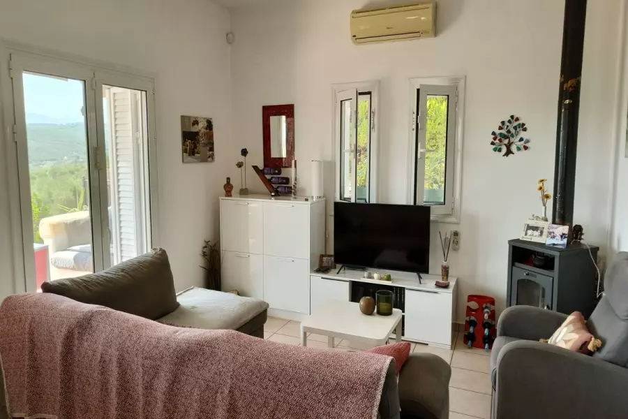 Внутри дом располагает светлой кухней и гостиной зоной с окнами, которые пропускают естественный свет. Уютная дровяная печь в гостиной обеспечивает тепло в зимние месяцы. В доме есть две спальни со встроенными шкафами и прямым выходом в сад через балконные двери, а также две ванные комнаты.