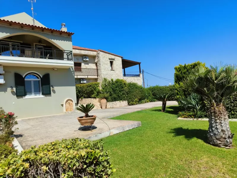 Снаружи дом окружен ландшафтным садом с травой, каменными стенами и небольшим крытым помещением для хранения вещей с раковиной. Когда-то это был традиционный критский дом, но недавно он был отреставрирован в соответствии с современными стандартами жизни, сохранив традиционный характер и декор.