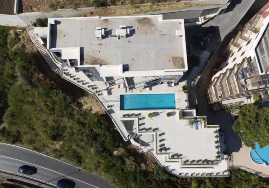 Виллы образуют два блока. Два здания на одном уровне, и третья – отдельно стоящая, ниже уровнем. Здесь так же имеются апартаменты для обслуживающего персонала. Виллы соединяются лестницами и проходами, с выходами на общую территорию.
