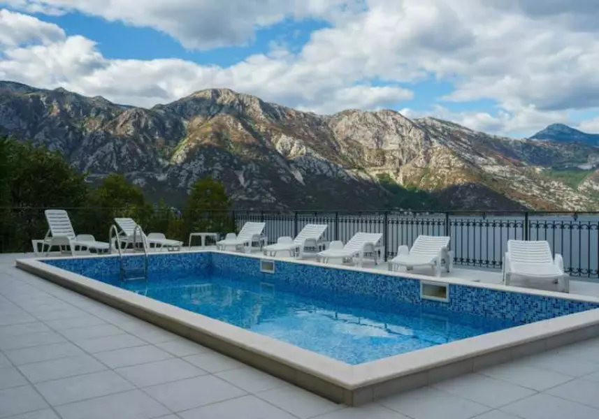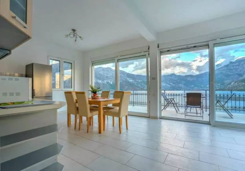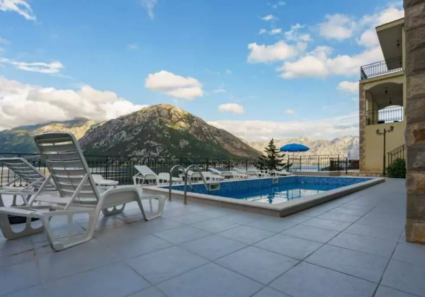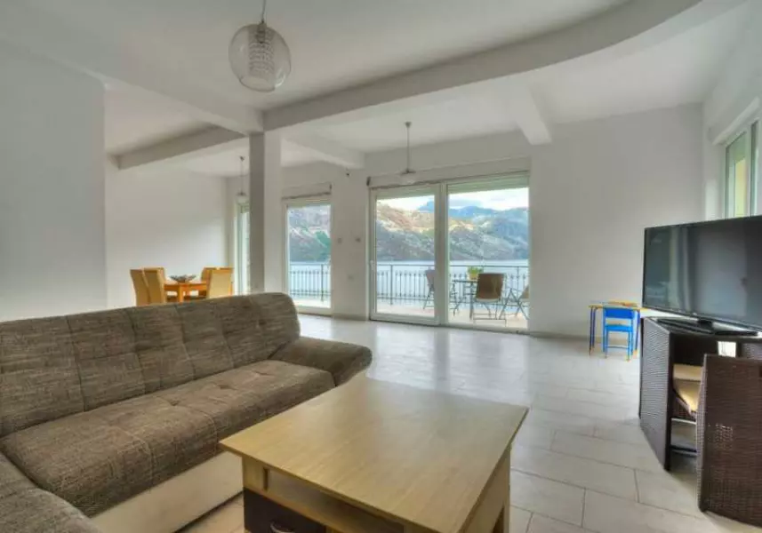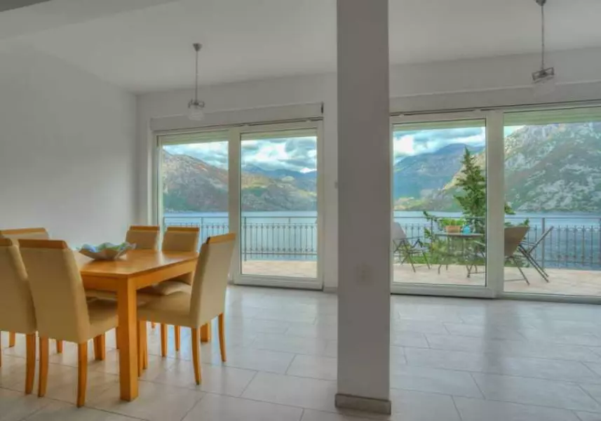 Новая, трёхэтажная вилла, на расстоянии 5 метров от моря. Великолепные виды открываются с террас – на Боко Которскую бухту и город Рисан. Пляж – в двух шагах. На зелёной лужайке – зона барбекю и удобные шезлонги для принятия солнечных ванн.