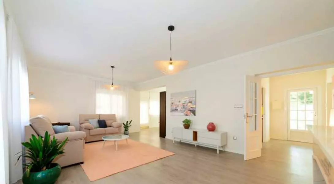 Одноэтажный дом площадью 177 кв. м. состоит из трех спален, двух ванных комнат, кладовой, кухни и просторной гостиной-столовой, террасы, где круглый год можно наслаждаться солнцем и видами. Вилла полностью отремонтирована, обставлена новой мебелью, есть камин. На участке площадью 700 кв.м. есть внутренний двор, площадка для барбекю, собственный бассейн. В стоимость входит гараж 40 кв.м.