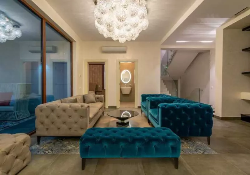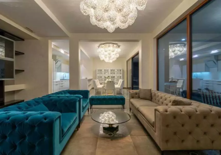 Большая кухня 80м2, совмещённая со столовой и выходом на большую террасу 56м2. Одна спальня 30м2 с ванной 7м2.