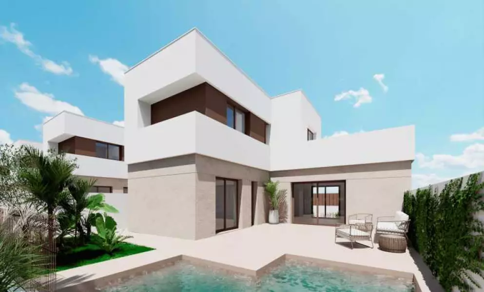 Вилла площадью 112,39 кв.м. состоит из трех спален, двух ванных комнат, гостевого туалета, гостиной с открытой кухней, просторной террасы площадью 16,59 кв.м., на которой можно любоваться шикарными видами на поле для гольфа и море Мар Менор.