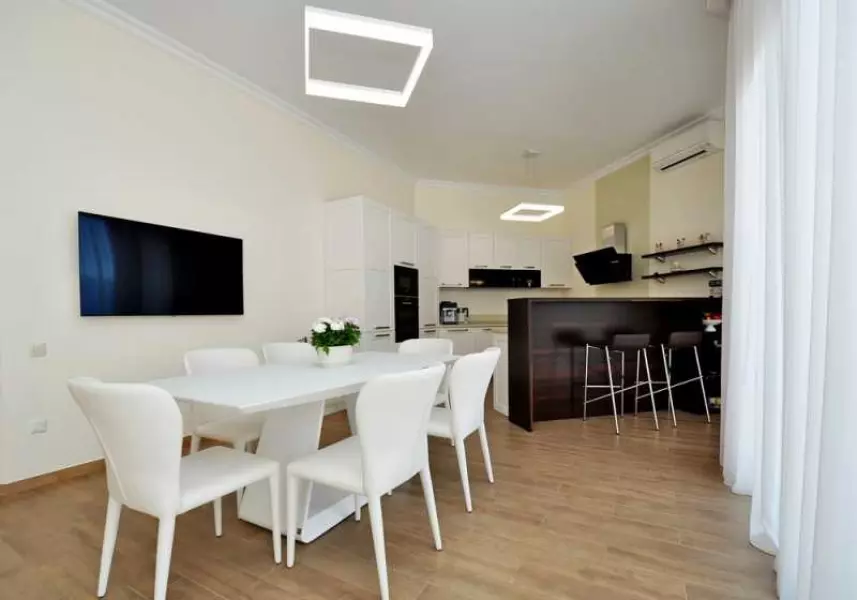 - На первом этаже – очень просторная, объемная гостиная с камином, кухня с обеденной зоной, гардеробная, гостевой туалет, кладовая и спальня с собственной ванной комнатой. Из гостиной и спальни имеется выход на открытую террасу к зоне отдыха с летней мебелью и бассейну – даже с этого уровня открывается замечательный, панорамный вид на Тиват и залив.