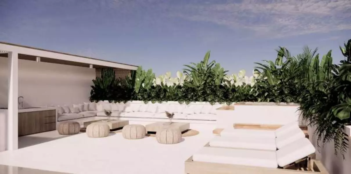 Красивый руфтоп с полностью функционирующей кухней и просторной гостиной.