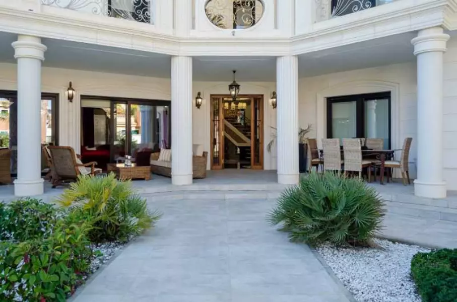 Вилла в два этажа площадью 606 м2 построена на участке площадью 1218 м2. Дом включает в себя пять спален, пять ванных комнат, гостиную, кухню, просторную комфортабельную столовую, просторную террасу с несколькими зонами отдыха. На первом этаже находится гостевая зона с просторной гостиной с кухней, две спальни, две ванные комнаты. На втором этаже расположены три спальни, три ванные комнаты, гардеробная. Все этажи дома соединены лифтом и лестницей. На крыше находится солярий с беседкой, откуда открывается вид на море и окрестности.