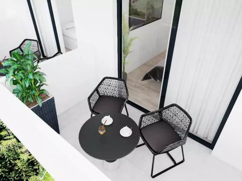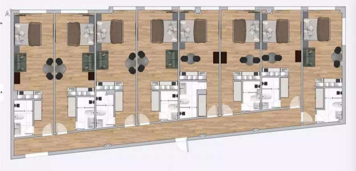 8 полностью оборудованных студий площадью от 17 до 22 м² каждая, с собственной кухней и террасой (5 м²).